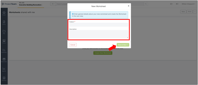 - An initial modal window will appear. Enter the Subject and an optional Description, then Save & Next to start the worksheet.
