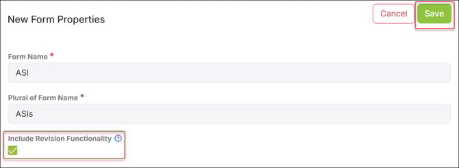 - The New Form Properties pane page will open. Enter the Form Name and verify the Plural of Form Name is correct. click the checkbox next to "Include Revision Functionality".