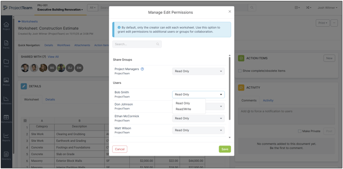 Creators of Gantt schedules and Worksheets can now grant edit permissions to other users. Previously, only the creator of each item could make edits. With this enhancement, creators can choose specific users who should have edit access while maintaining read-only access for others.